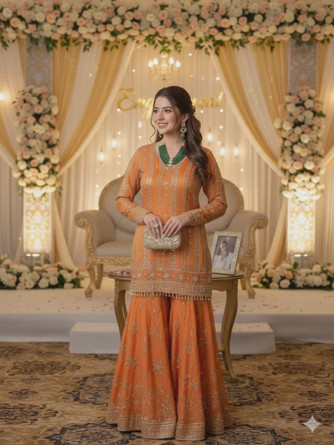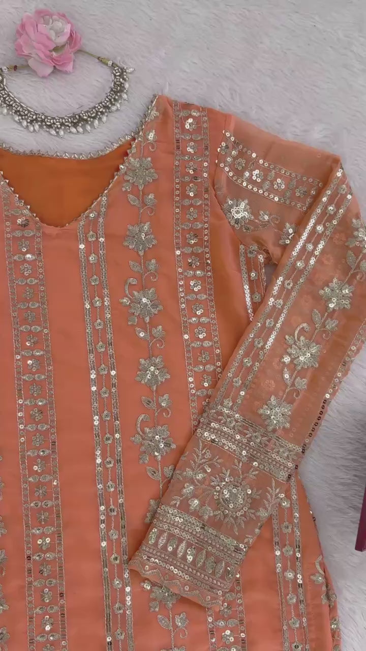 Step into timeless charm with our exclusive 3-piece ethnic ensemble, designed to bring out your grace with every step. Crafted from premium Foux Georgette and adorned with delicate thread and sequin work, this set blends comfort with celebration-ready style.