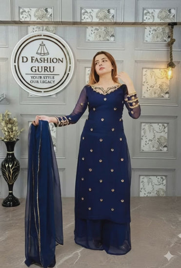 Radiate elegance and comfort with this beautifully crafted Faux Georgette Suit Set, designed to bring a perfect balance of sophistication and style. Featuring a finely embroidered top, comfortable palazzo, and a graceful dupatta, this outfit is a must-have for festive and semi-formal occasions.