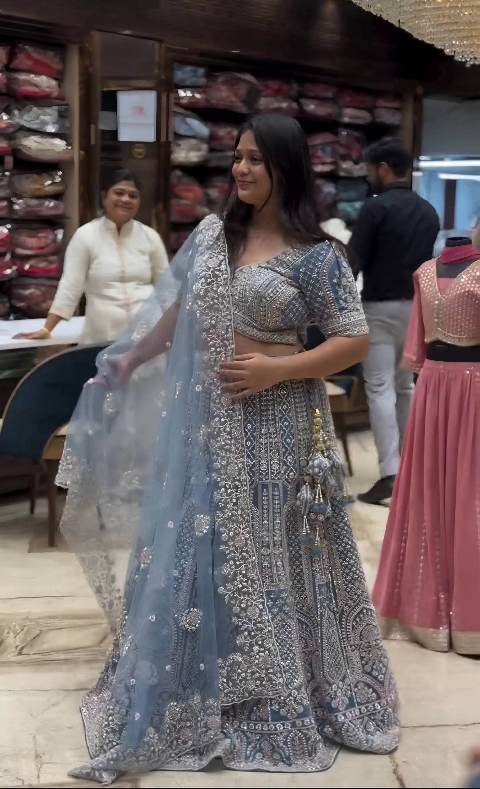 👑 Shine like royalty in every twirl — elegance wrapped in Butterfly Net perfection! ✨🌸📦 Package Includes: Lehenga, Blouse & Dupatta (with Zip)