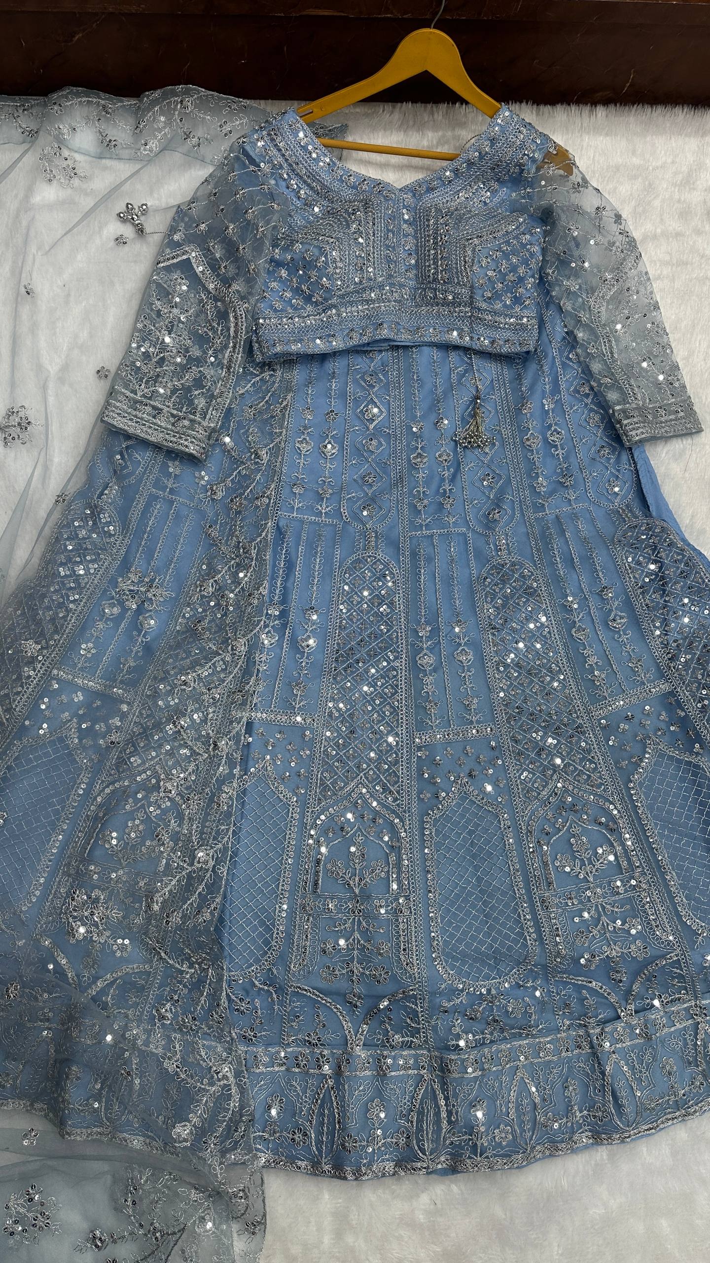 Step into pure elegance with this intricately embroidered Butterfly Net lehenga. A masterpiece of sequins and cording work — perfect to make every celebration feel royal! 👑💖