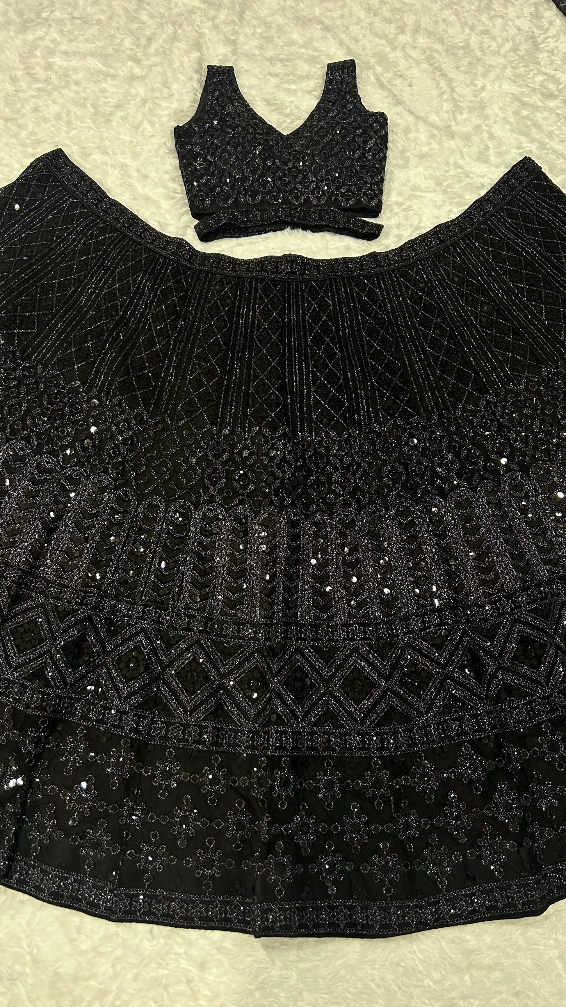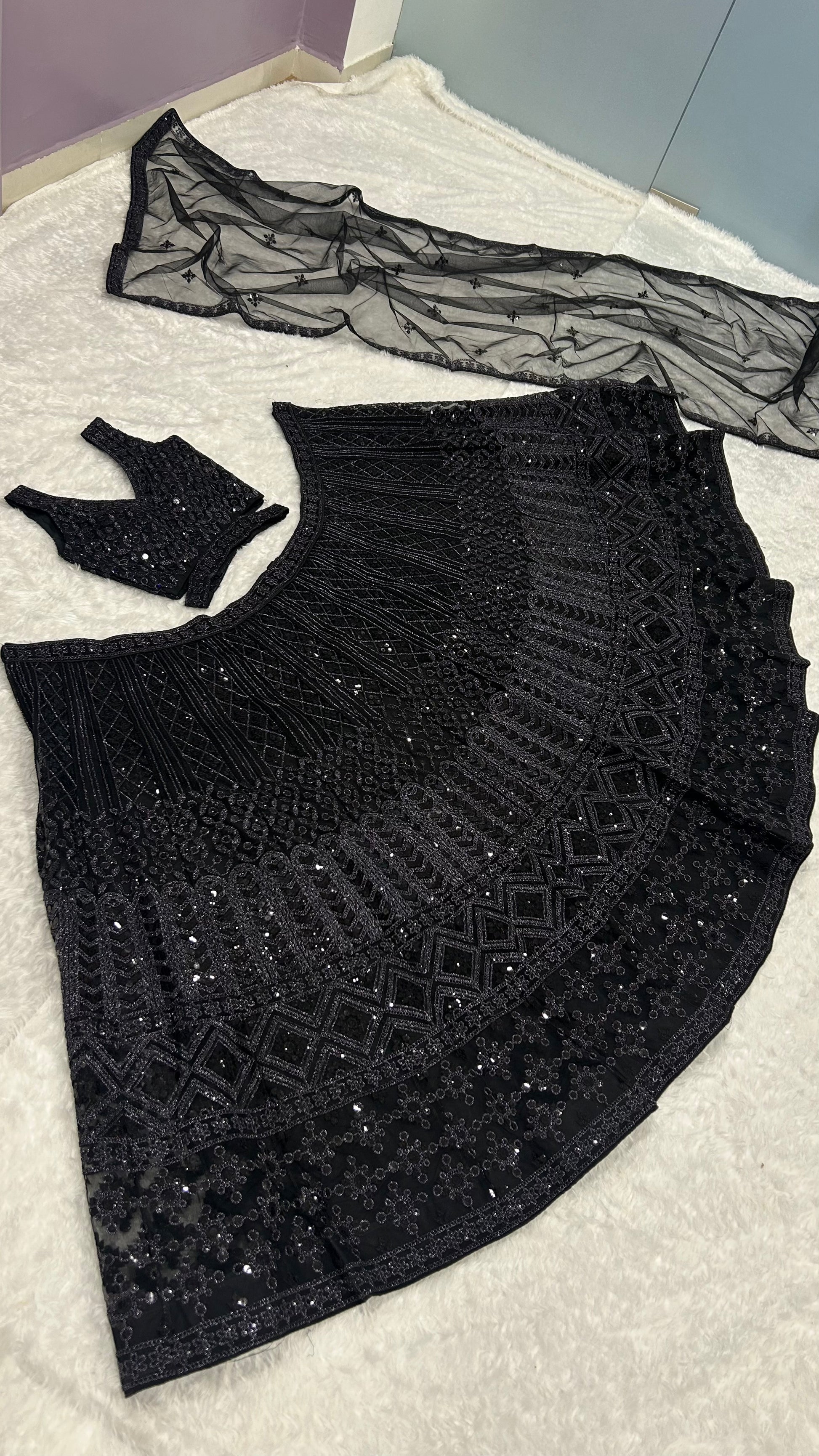 Slay your festive and party looks with this stunning Net Lehenga–Blouse–Dupatta set, crafted to deliver dramatic flair and glamorous sparkle. The lehenga features intricate dori & sequin embroidery with a grand 3.5-meter flare, enhanced by attached can-can for a voluminous, princess-like silhouette. The matching net blouse, richly embellished with dori & sequin work on both front and back, lets you tailor the perfect fit with its unstitched fabric. Completing the ensemble is a coordinated net dupatta with matching embroidery, adding sheer elegance to the overall look. A stylish embroidered work belt is included to accentuate the waist and elevate the designer finish. Perfect for cocktail parties, wedding functions, sangeet nights, and evening celebrations.