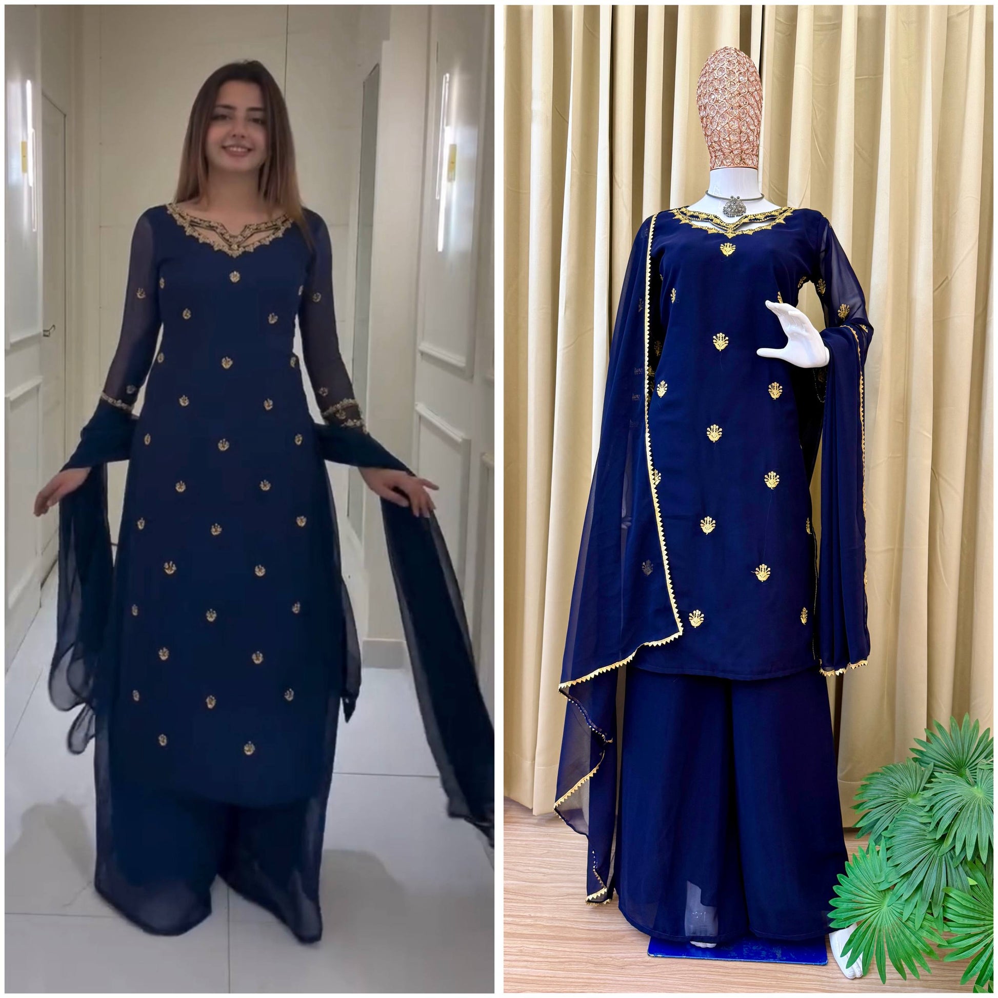 Presenting our New Superhit Festive Collection Kurti, Plazzo & Dupatta Set, crafted on rich Faux Georgette fabric with elegant embroidery and cut-work detailing. This 3-piece ensemble combines comfort, sophistication, and festive charm—perfect for celebrations, parties, and family functions.
