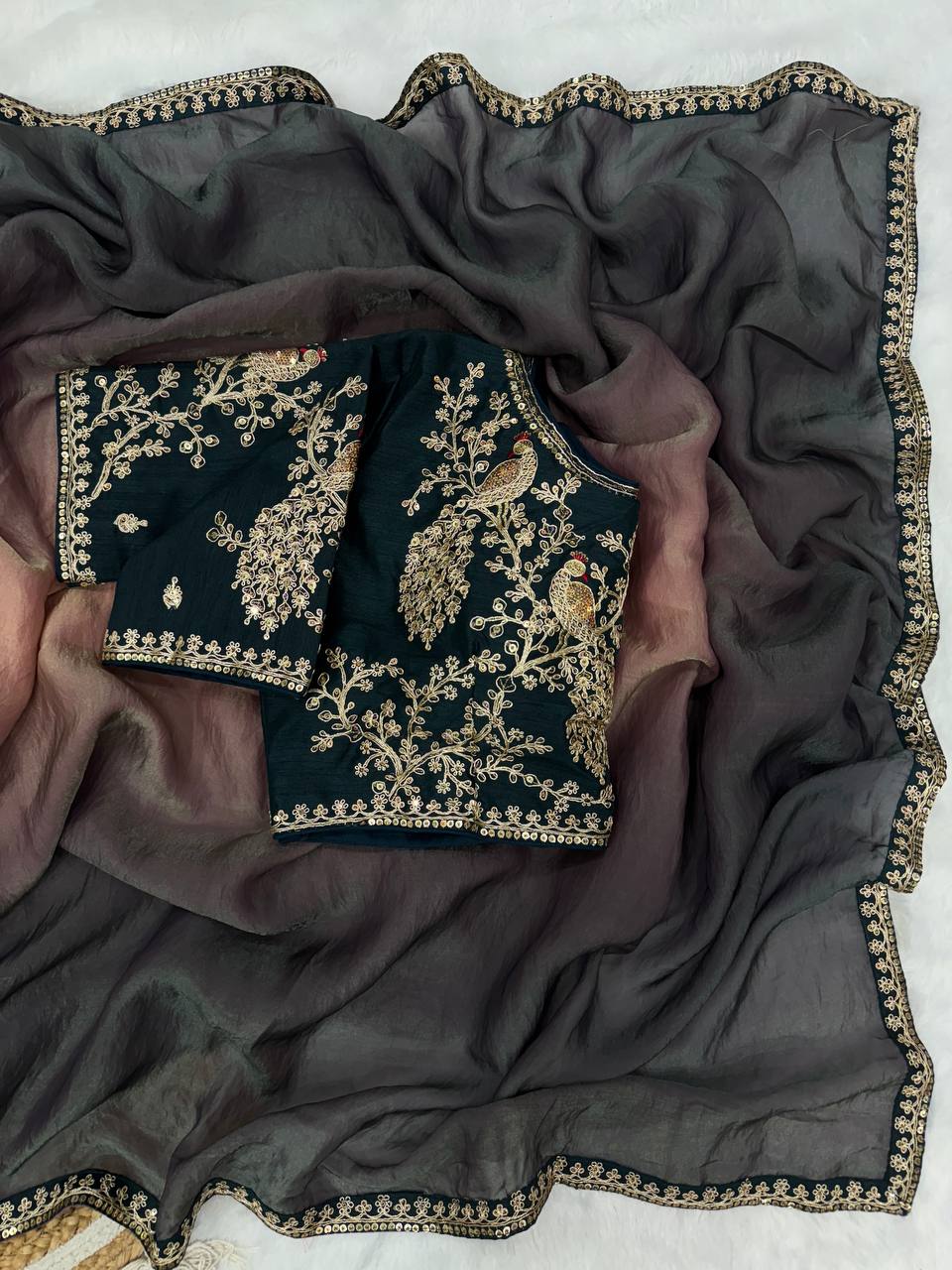 Drape yourself in pure sophistication with this shaded soft Space Silk saree, beautifully adorned with multicolor sequins and cording embroidery. The intricate scallop border adds a touch of regal charm, making it perfect for any grand celebration. Paired with a fully-stitched designer blouse, this ensemble is a true showstopper! ππ