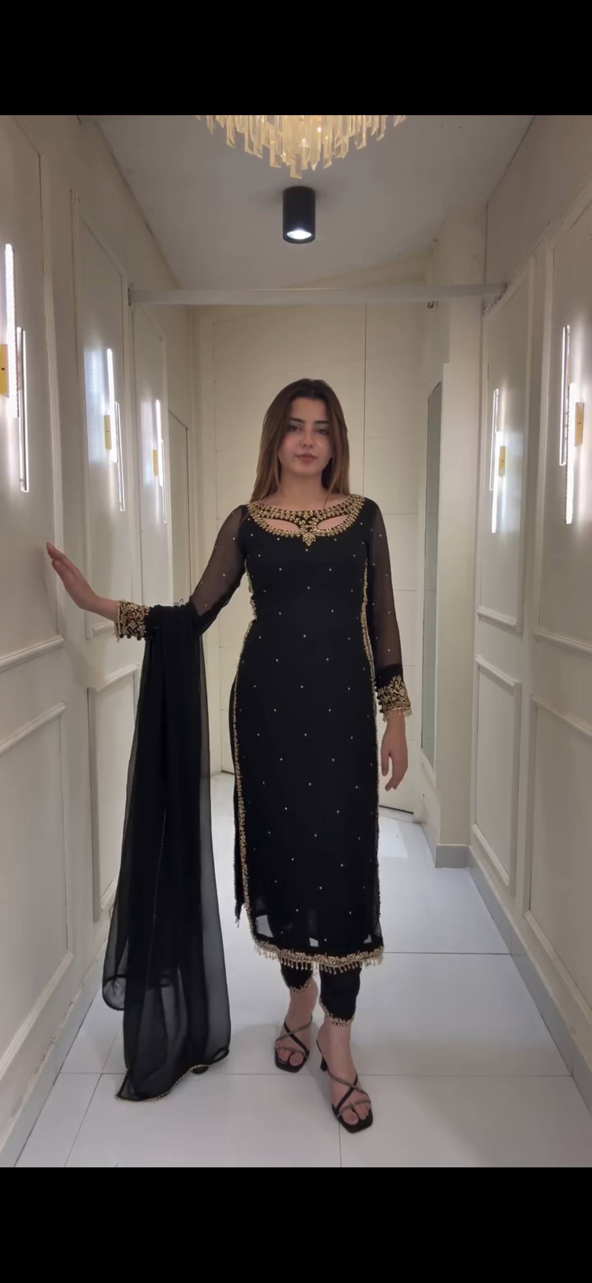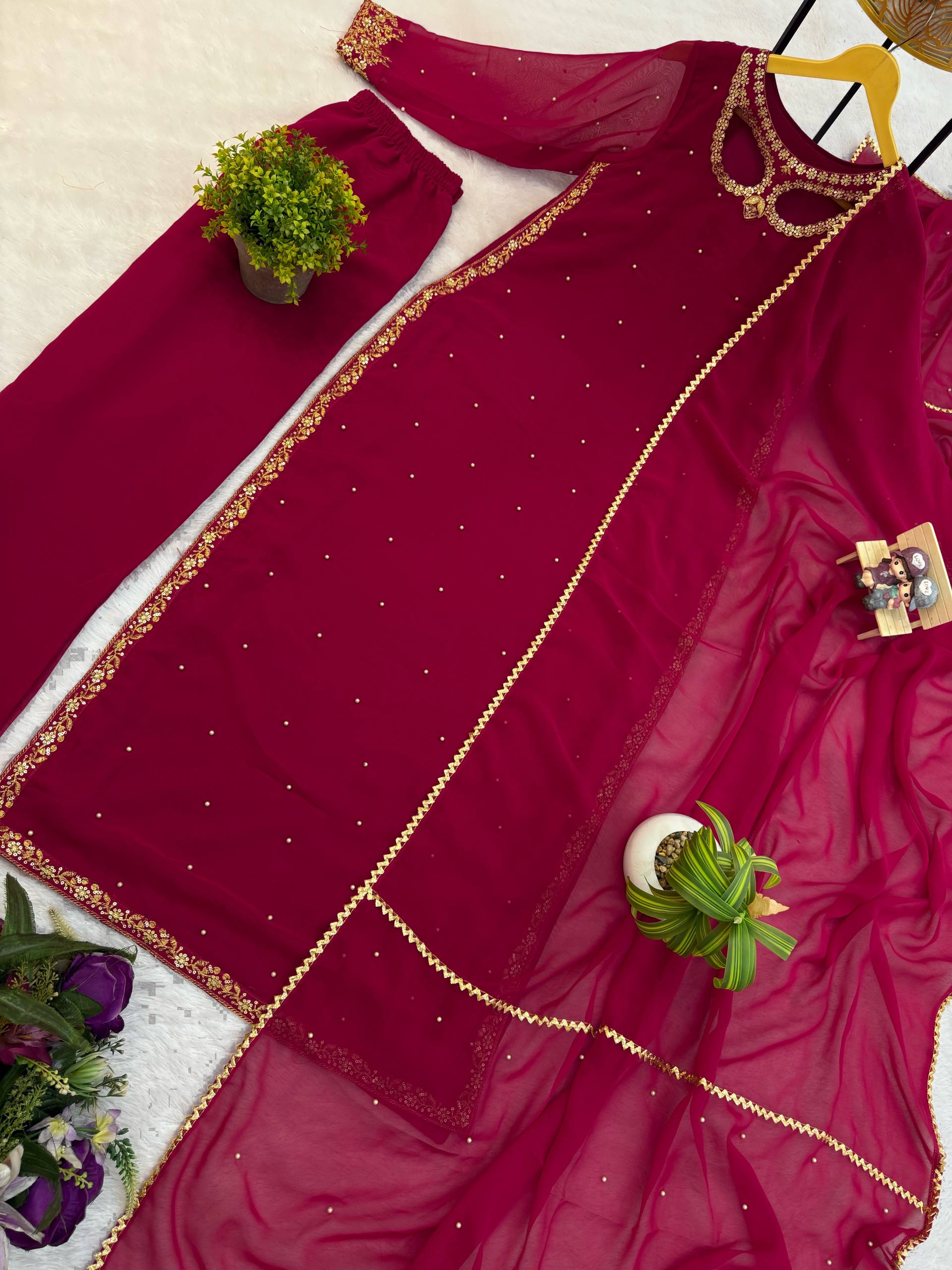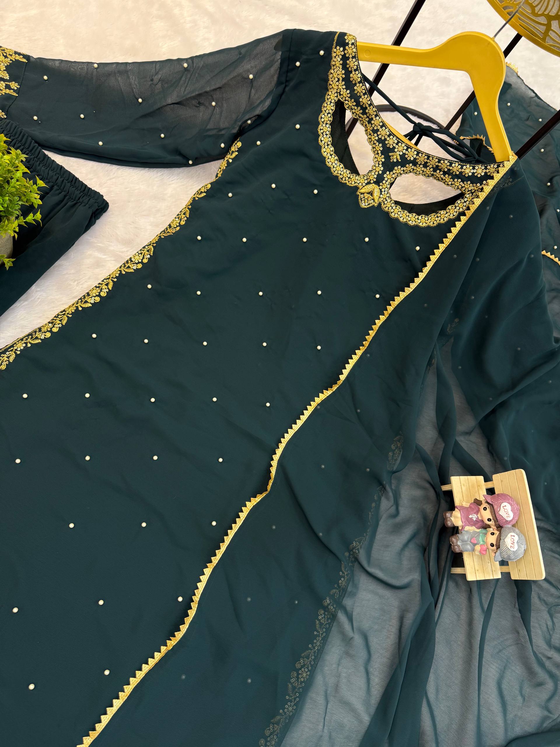 Introducing our New Superhit Festive Kurti, Pant & Dupatta Set, crafted in luxurious Faux Georgette with elegant embroidery and real pearl (moti) detailing. This designer 3-piece set delivers a perfect blend of grace, comfort, and festive shineβideal for weddings, functions, and celebrations.